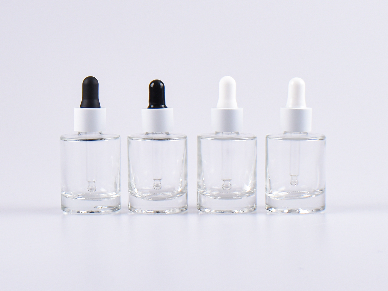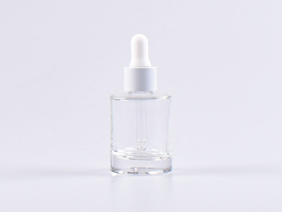 Hochwertige Glasflasche mit weisser Pipettenmontur.