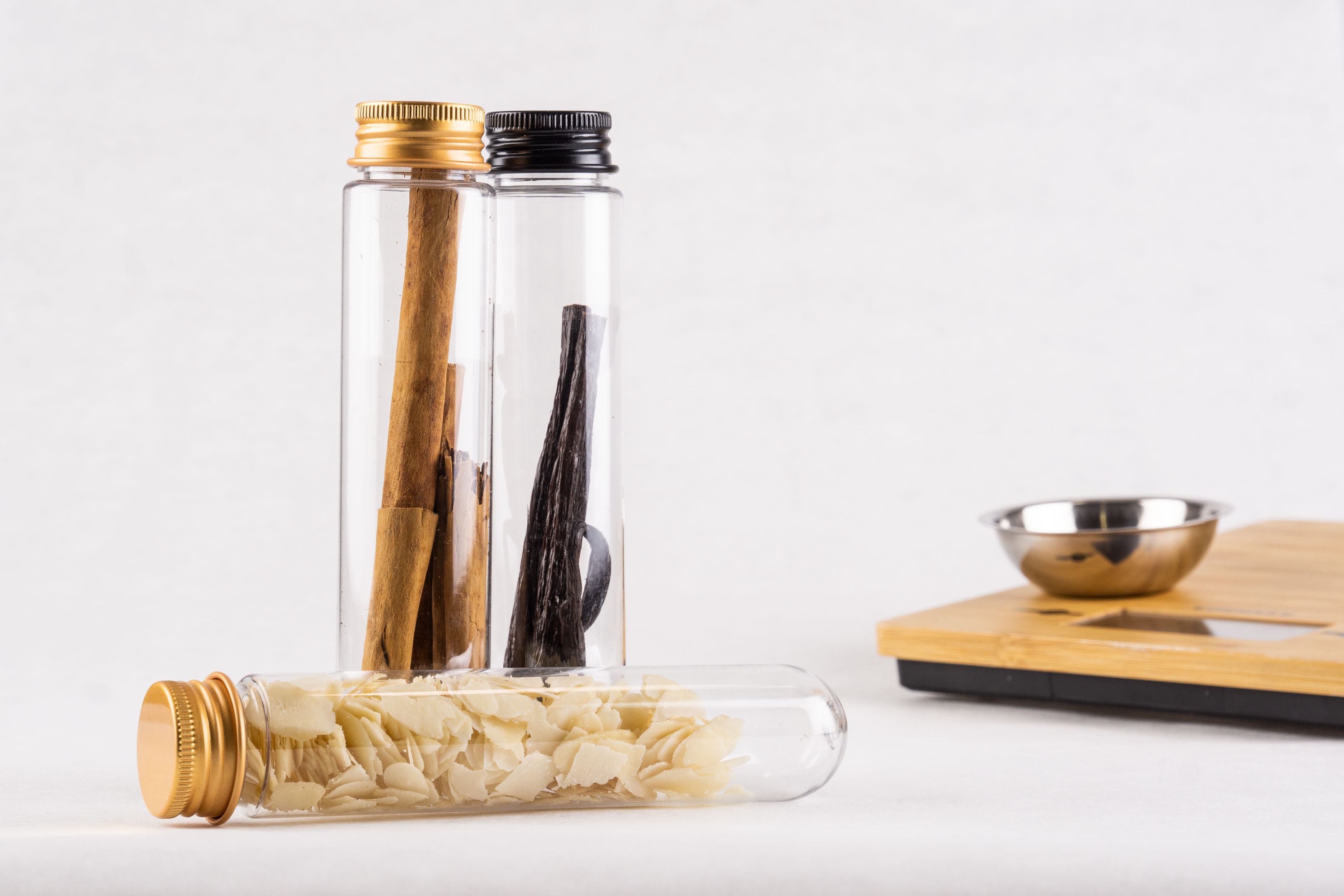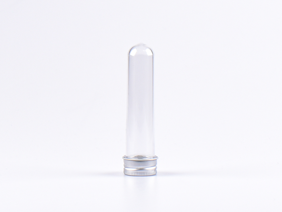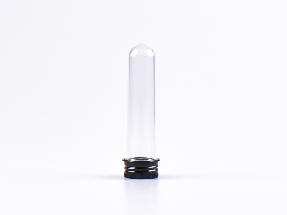 Kunststoffröhrchen mit leicht zylindrischem Flaschenkörper und dicht schliessender Alukappe.