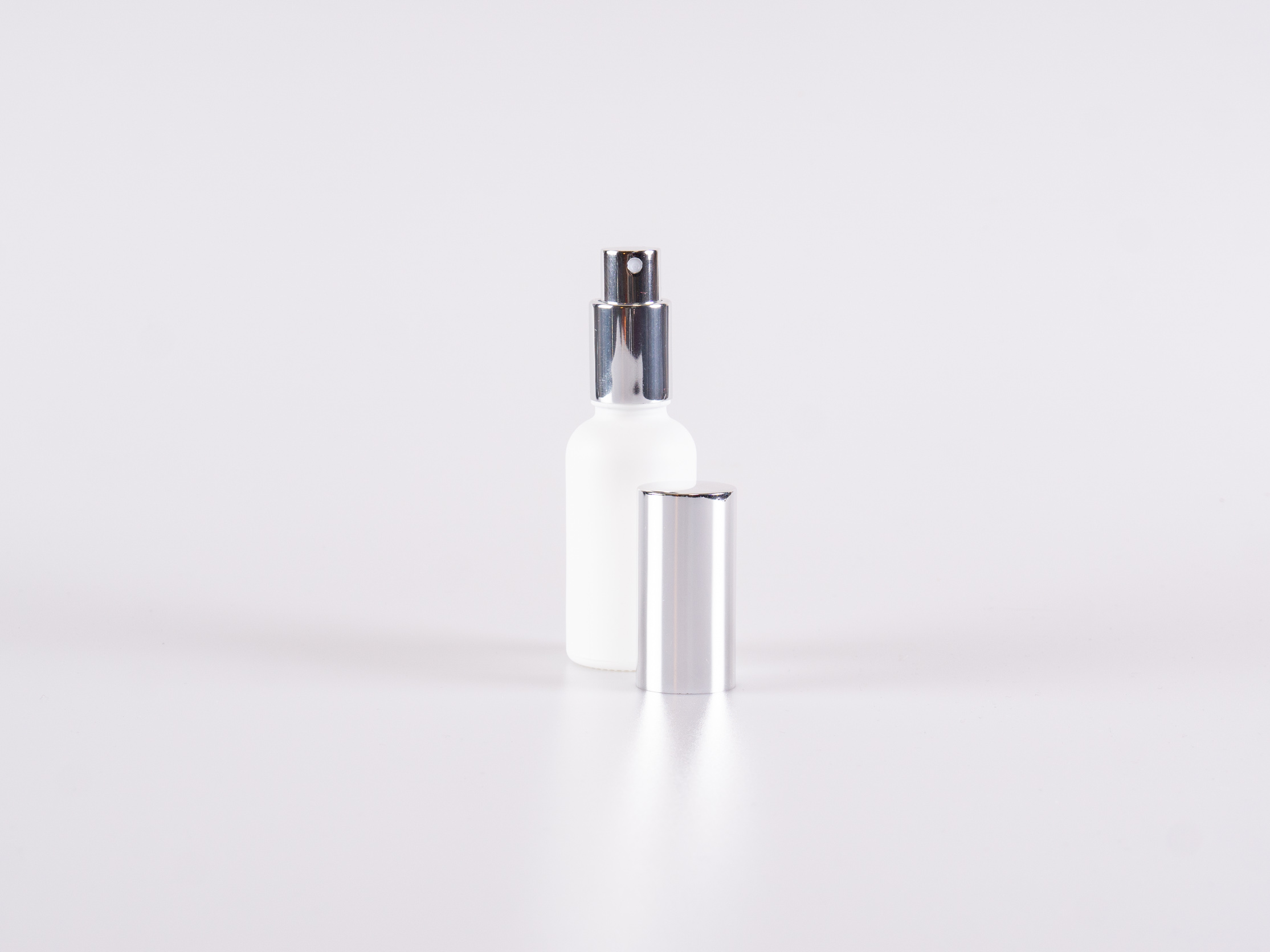 Edel und hochwertig, unsere matt-weisse Glasflasche mit glänzendem Zerstäuber inkl. Steckkappe.