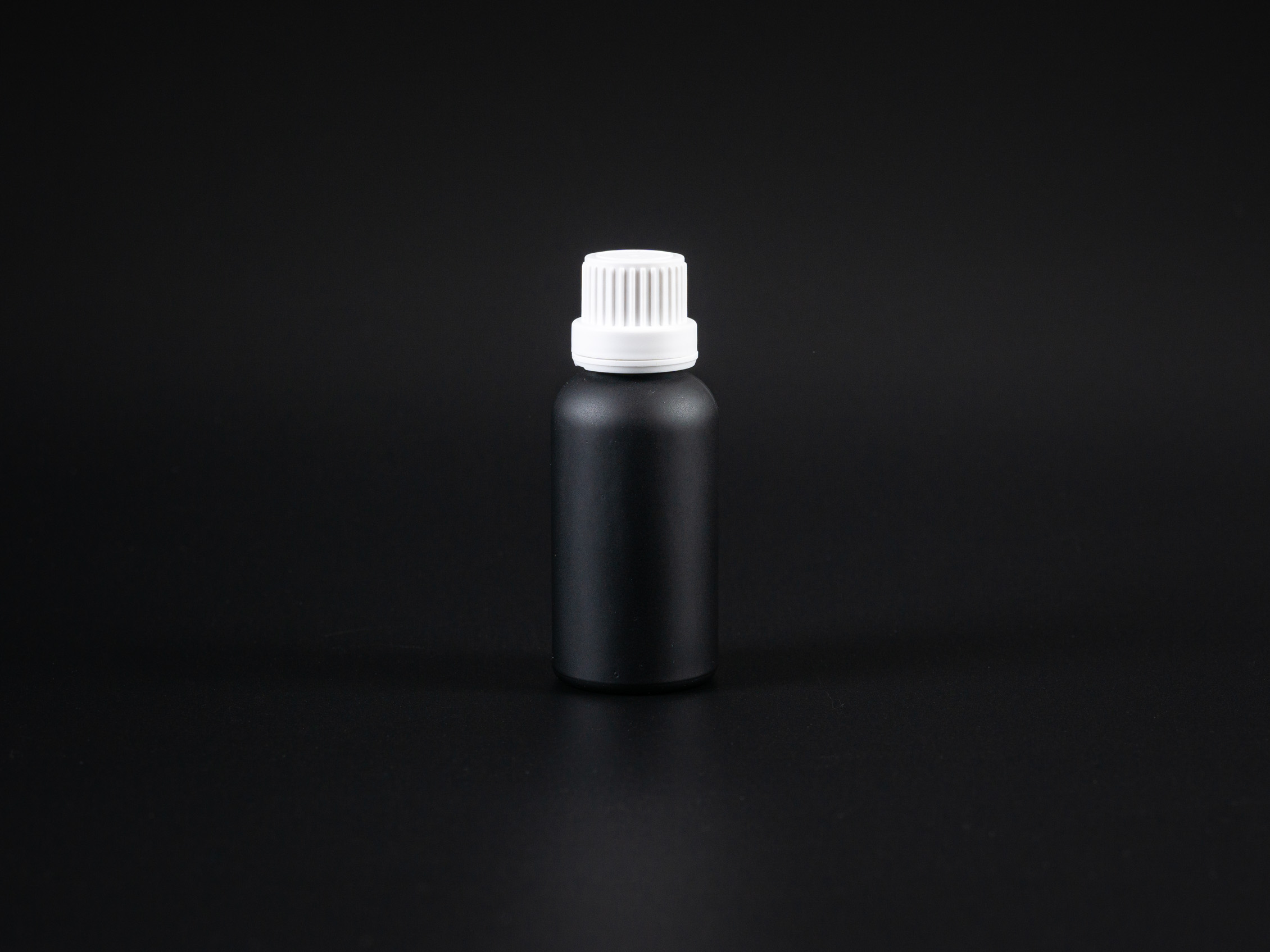 Die schwarz beschichtete Glasflasche schützt den Inhalt vor Sonnenlicht.
