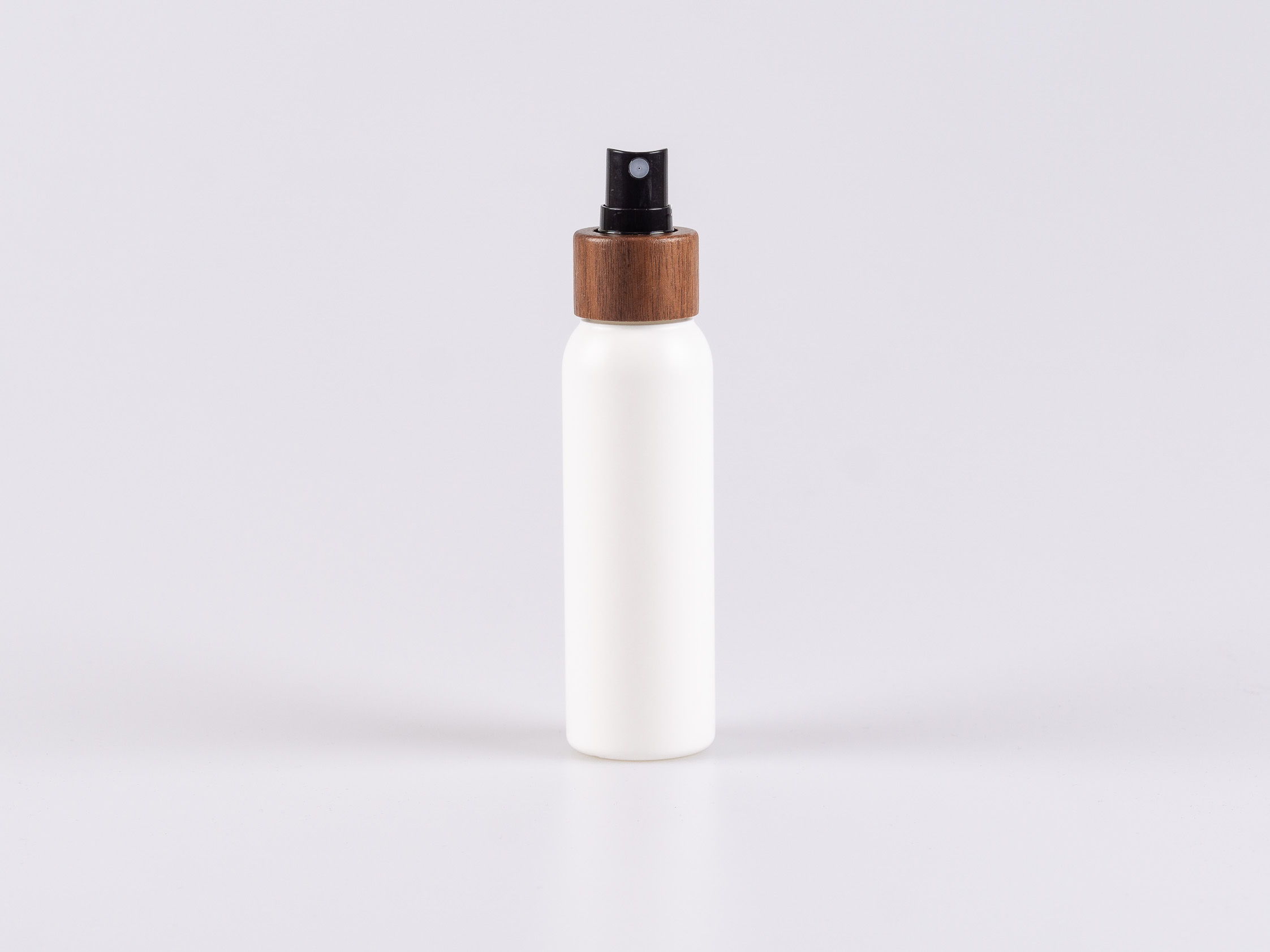 Weisse Flasche aus Kunststoff mit Spray aus echtem Nussbaumholz. Eine edle Kombination! Die Montur ist mit einem transparenten Deckel ausgestattet.