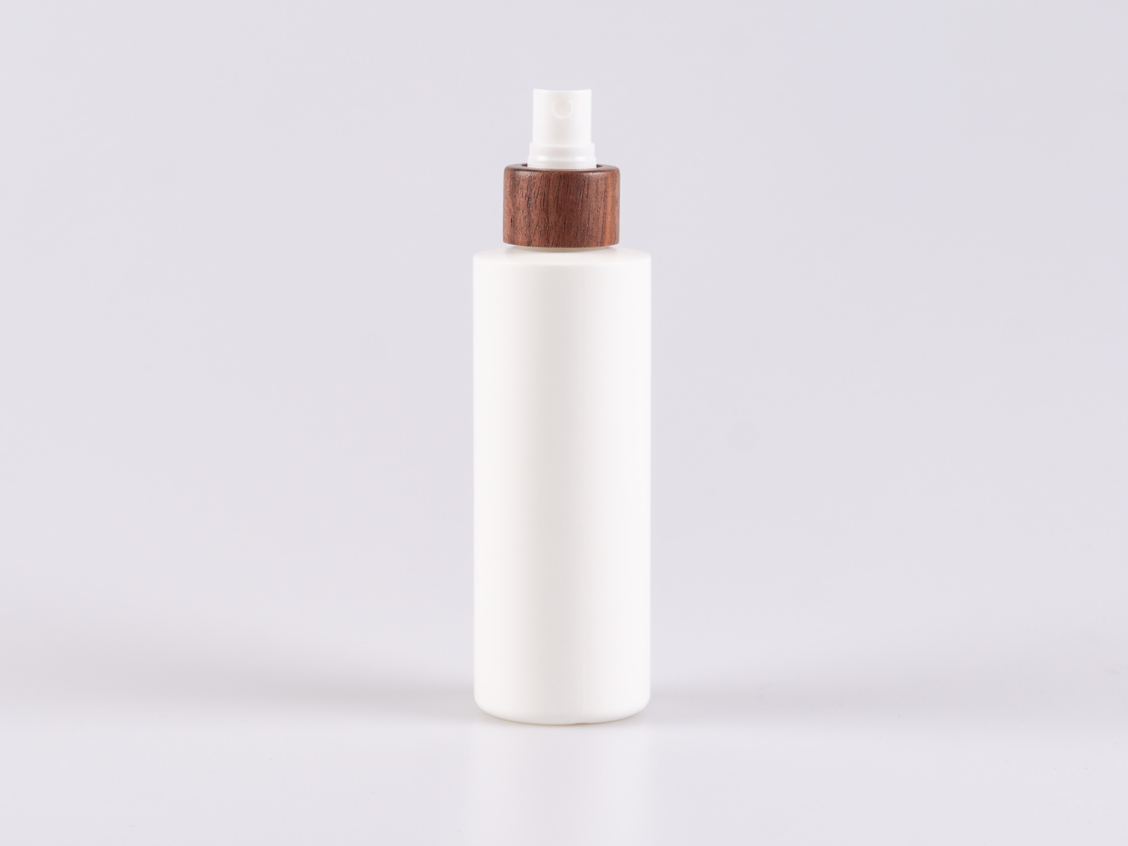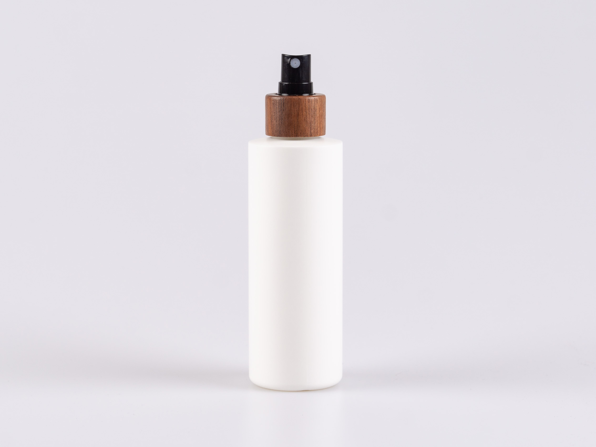 Weisse Flasche aus Kunststoff mit Spray aus echtem Nussbaumholz. Eine edle Kombination! Die Montur ist mit einem transparenten Deckel ausgestattet.