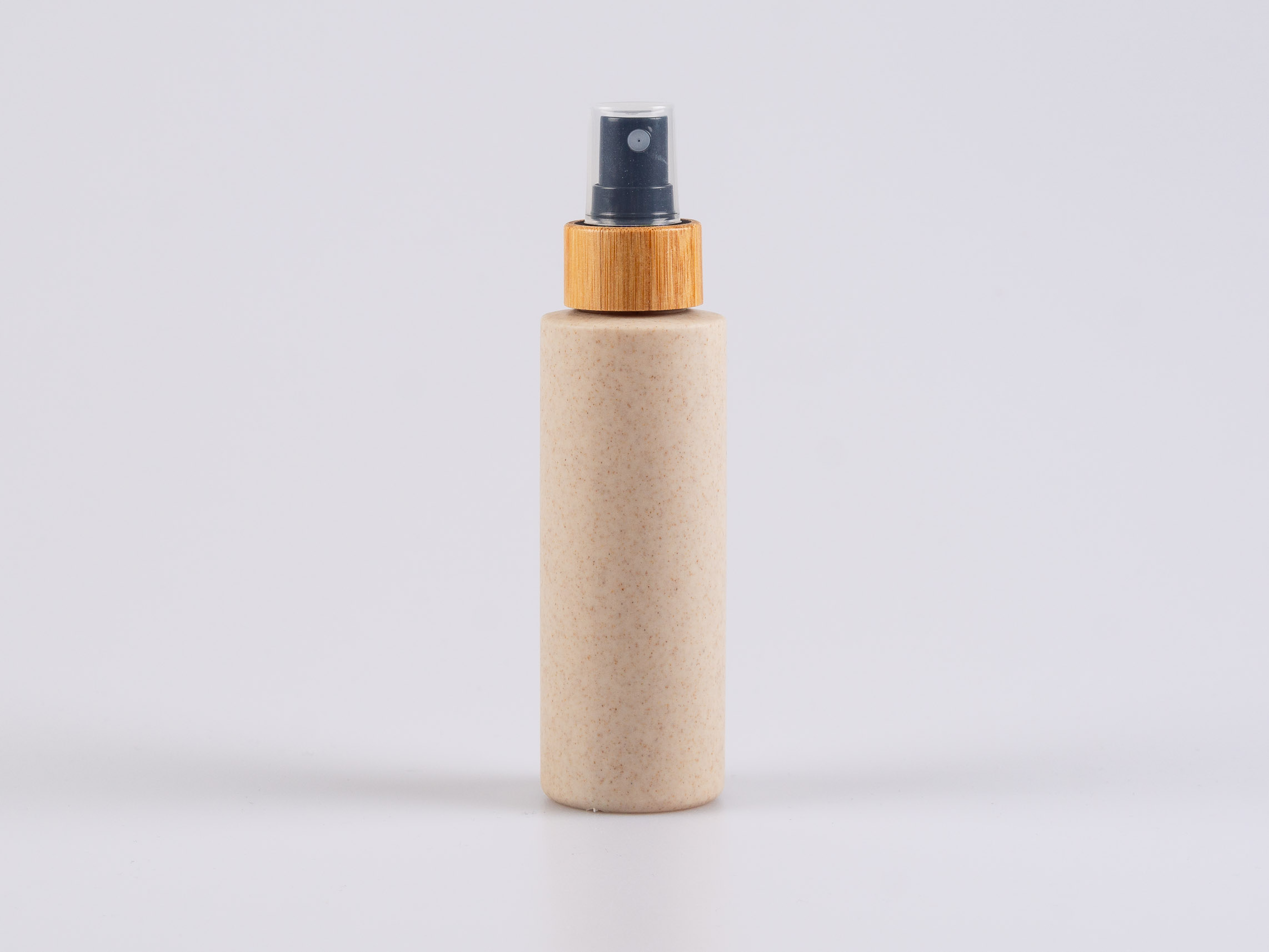 Elegante Biokomposit Flasche mit Spraymontur aus Bambus und gut sitzendem, transparentem Deckel.