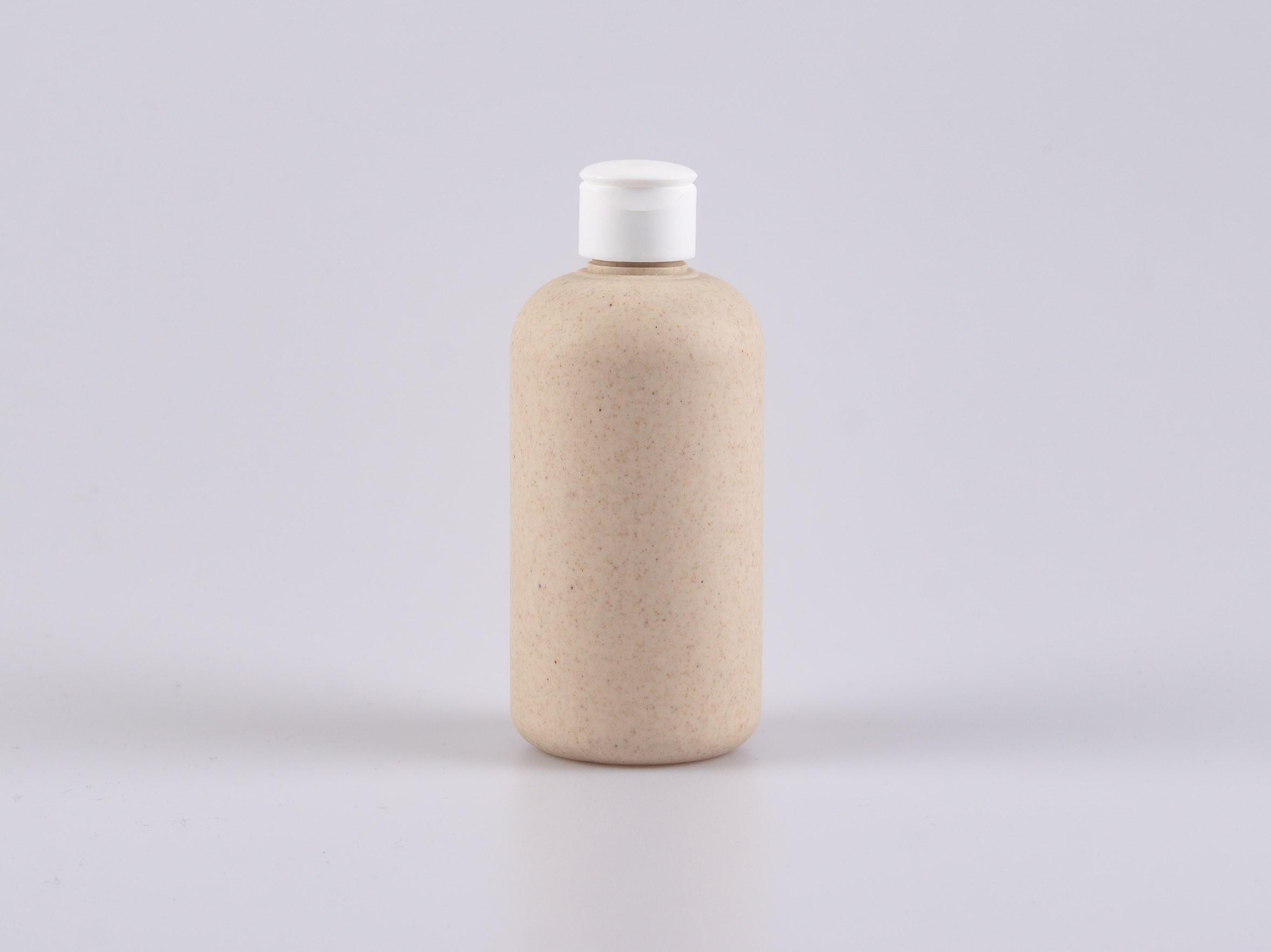 Diese Flasche ist ein biologisch abbaubarer Kosmetikbehälter aus Weizenfasern.