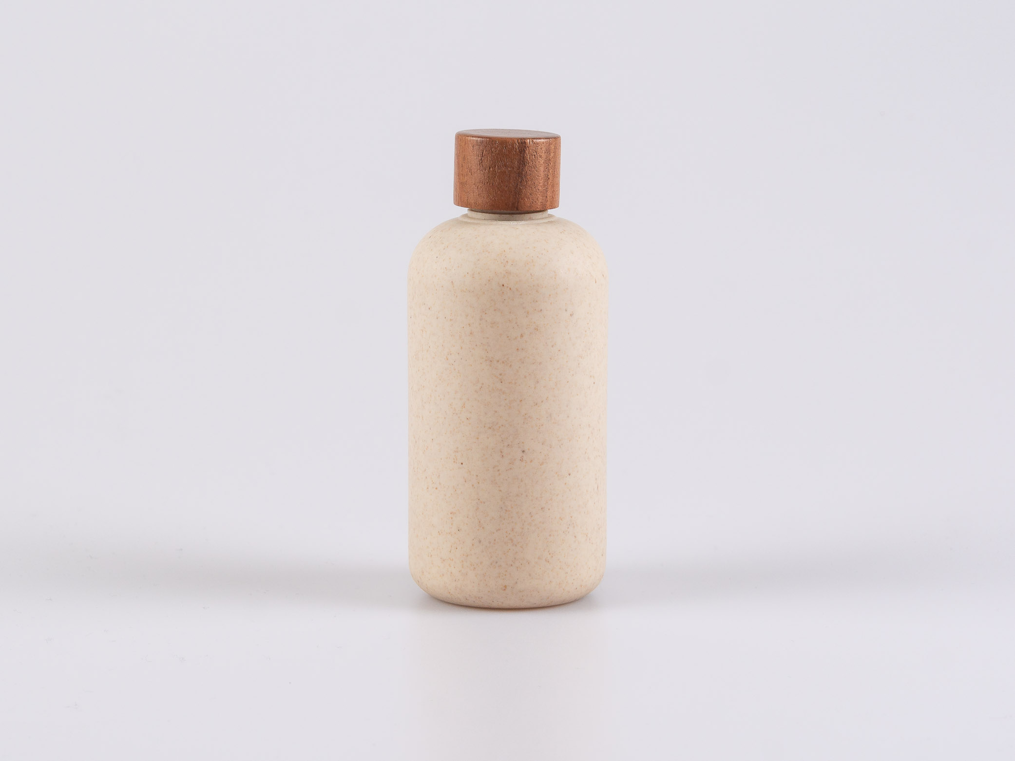 Diese Flasche ist ein biologisch abbaubarer Kosmetikbehälter aus Weizenfasern.