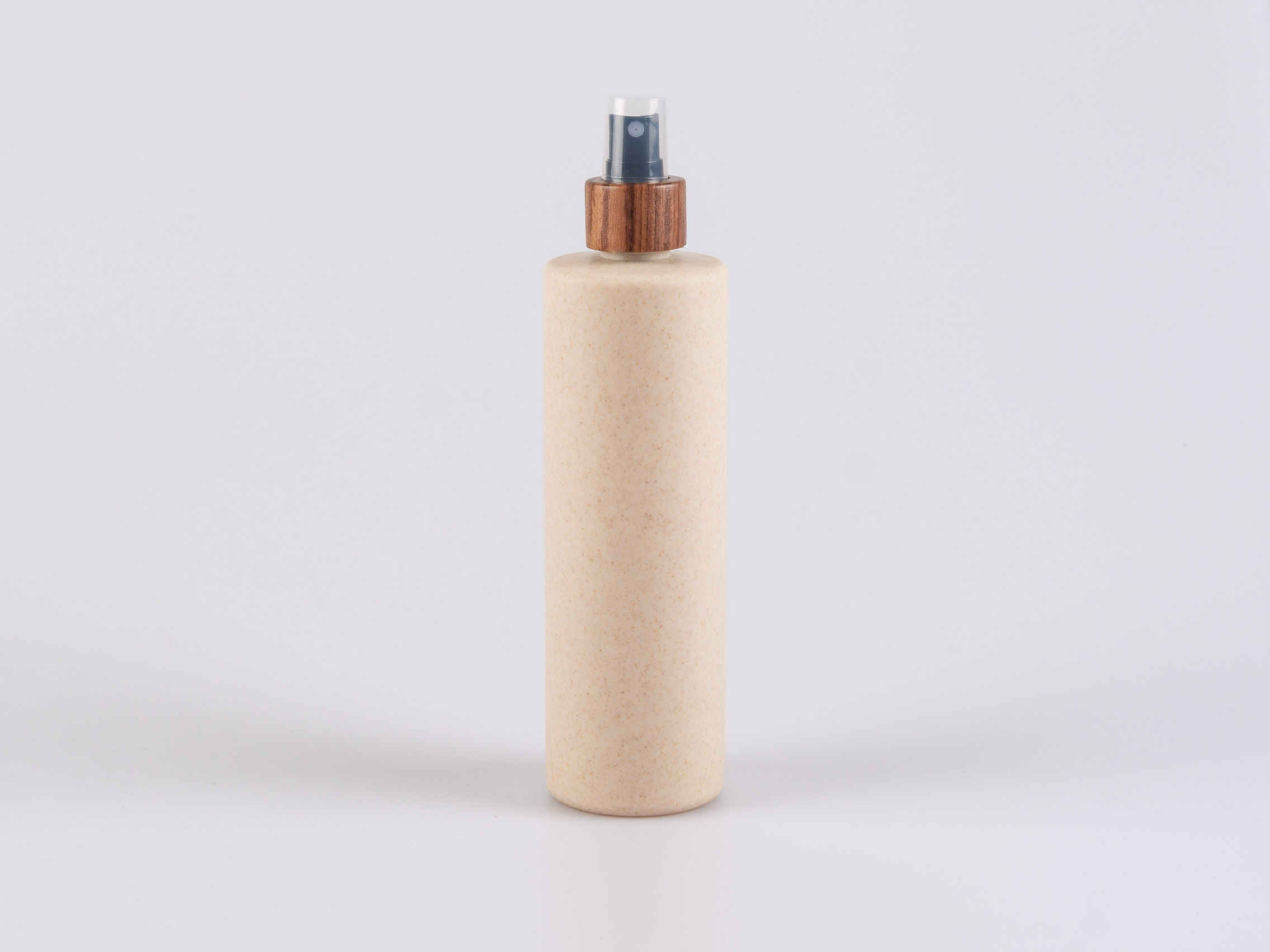Elegante Biokomposit Flasche mit Spraymontur aus Nussbaumholz und gut sitzendem, transparentem Deckel.