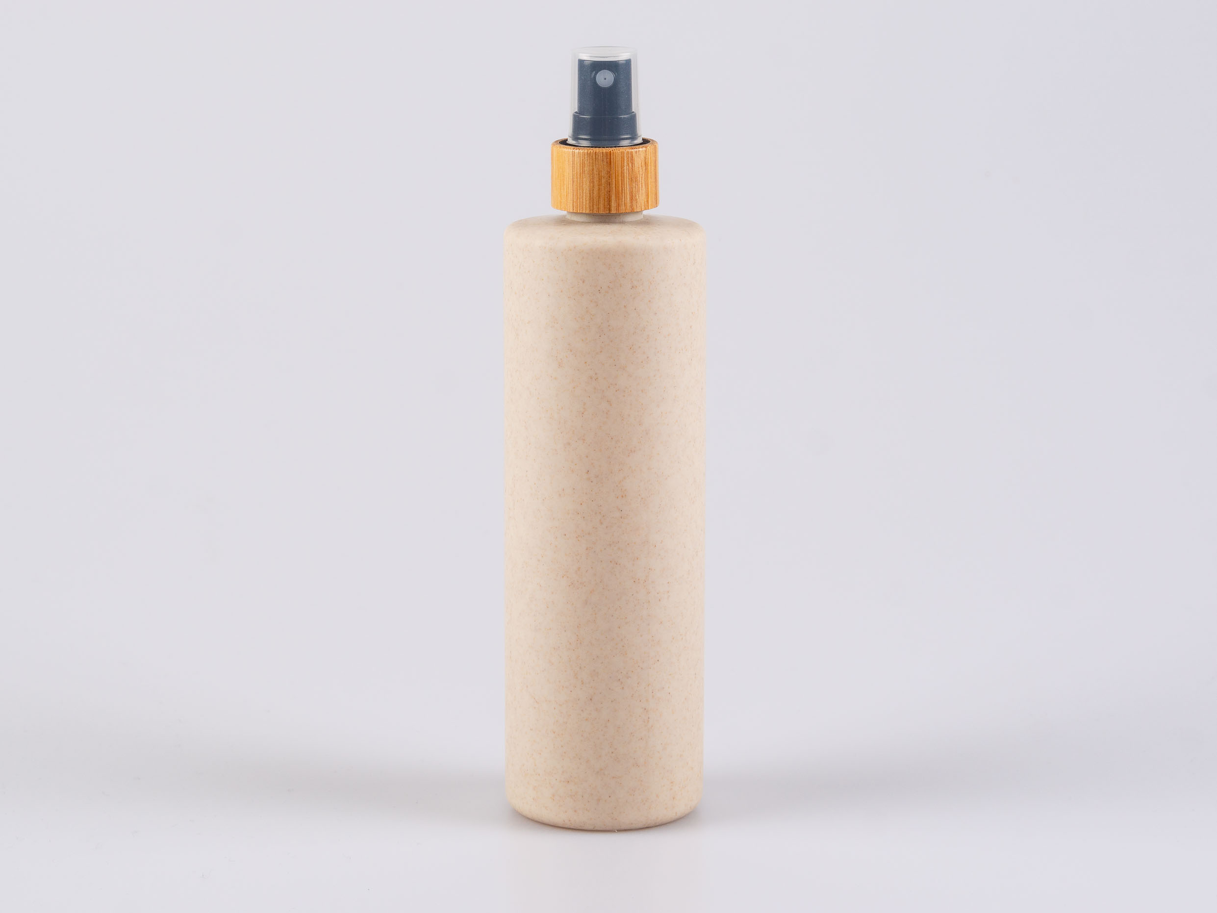 Elegante Biokomposit Flasche mit Spraymontur aus Bambus und gut sitzendem, transparentem Deckel.