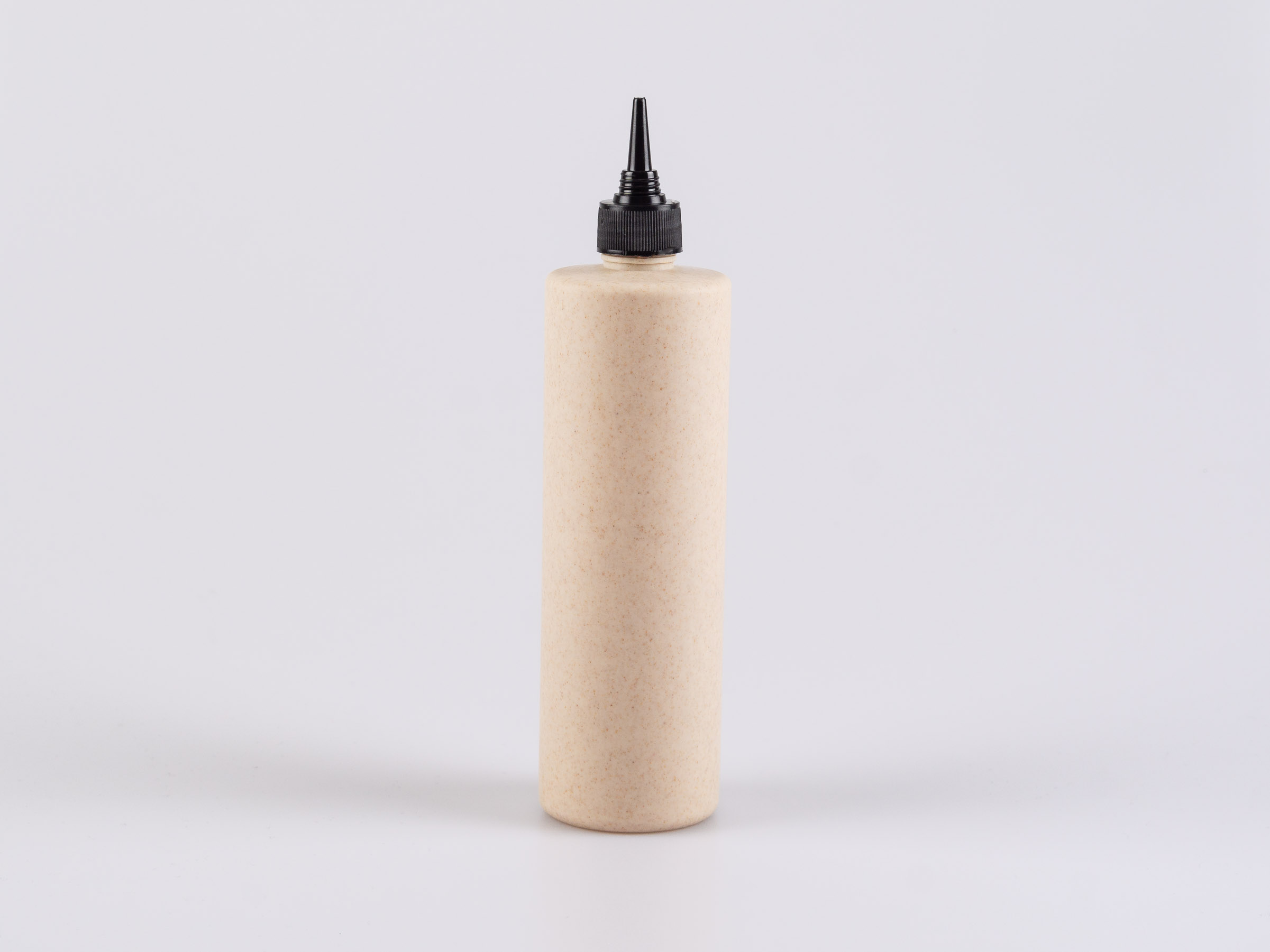 Diese Flasche ist ein biologisch abbaubarer Kosmetikbehälter aus Weizenfasern.