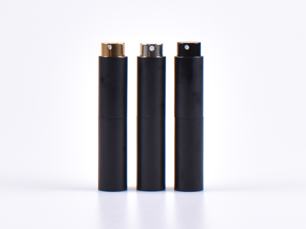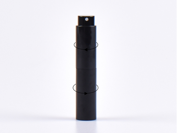 MIt einer Drehbewegung, wie beim Lippenstift, wird die Zerstäubermontur hoch gedreht oder zurück in die Hülle versenkt. Die Flasche lässt sich aus der Hülle nehmen und auffüllen.