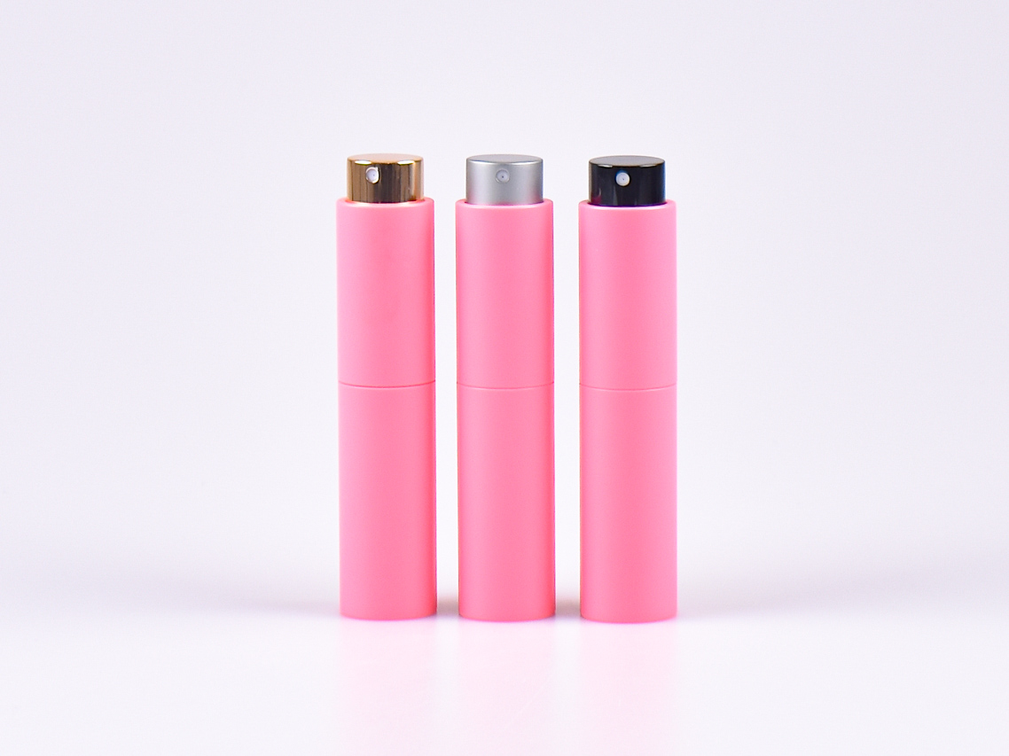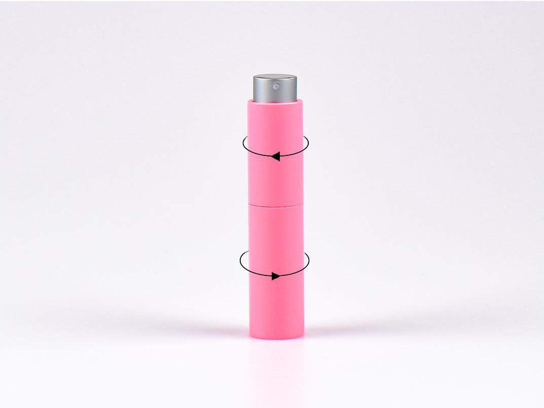 MIt einer Drehbewegung, wie beim Lippenstift, wird die Zerstäubermontur hoch gedreht oder zurück in die Hülle versenkt. Die Flasche lässt sich aus der Hülle nehmen und auffüllen.