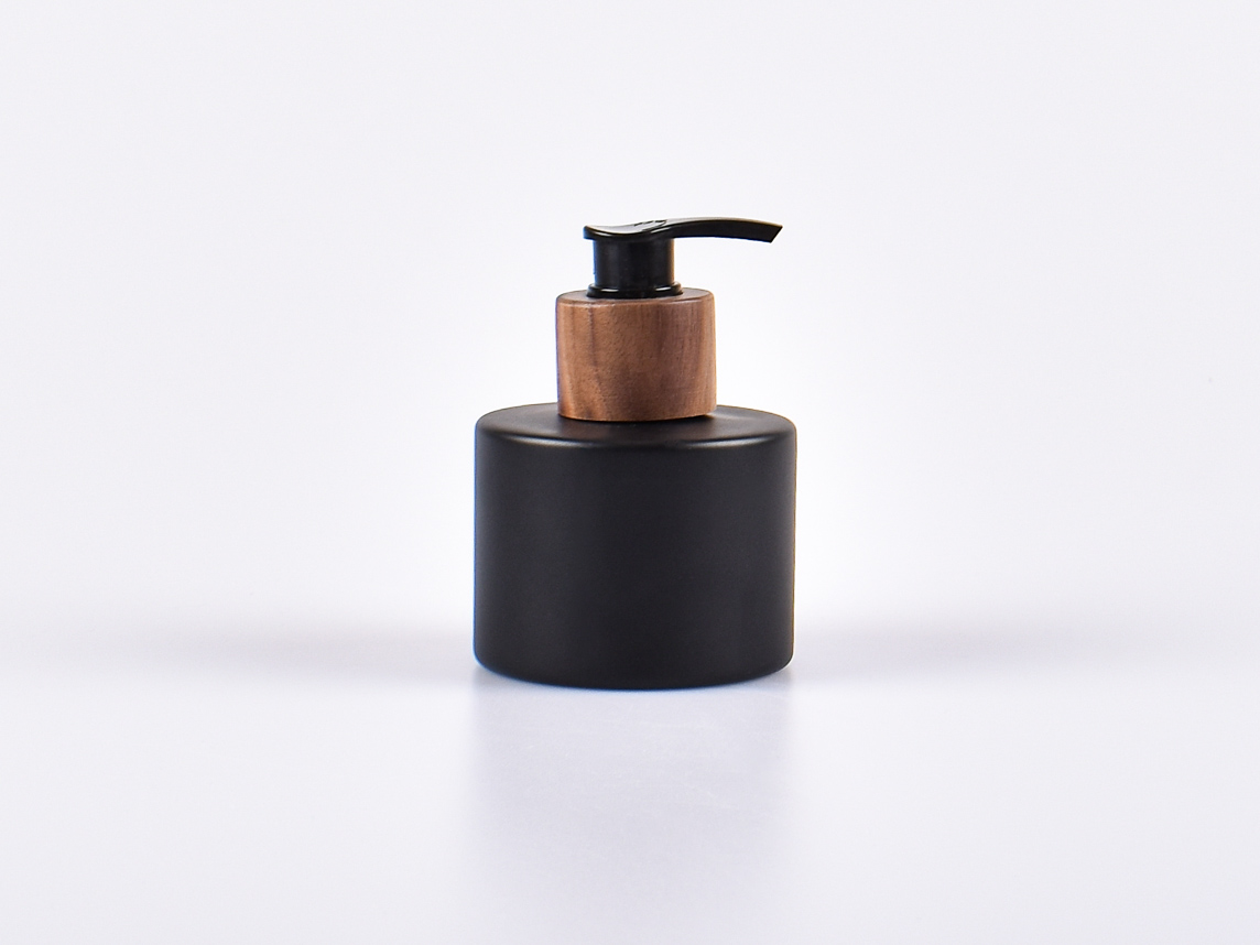 Stilvolle runde, niedrige Schwarzglasflasche mit Zerstäuber, eingefasst mit echtem Nussbaumholz. Unsere hochwertige Flasche bietet nicht nur eine robuste Verpackung für Ihre flüssigen Produkte, sondern schützt auch empfindliche Inhaltsstoffe vor schädlichen UV-Strahlen.