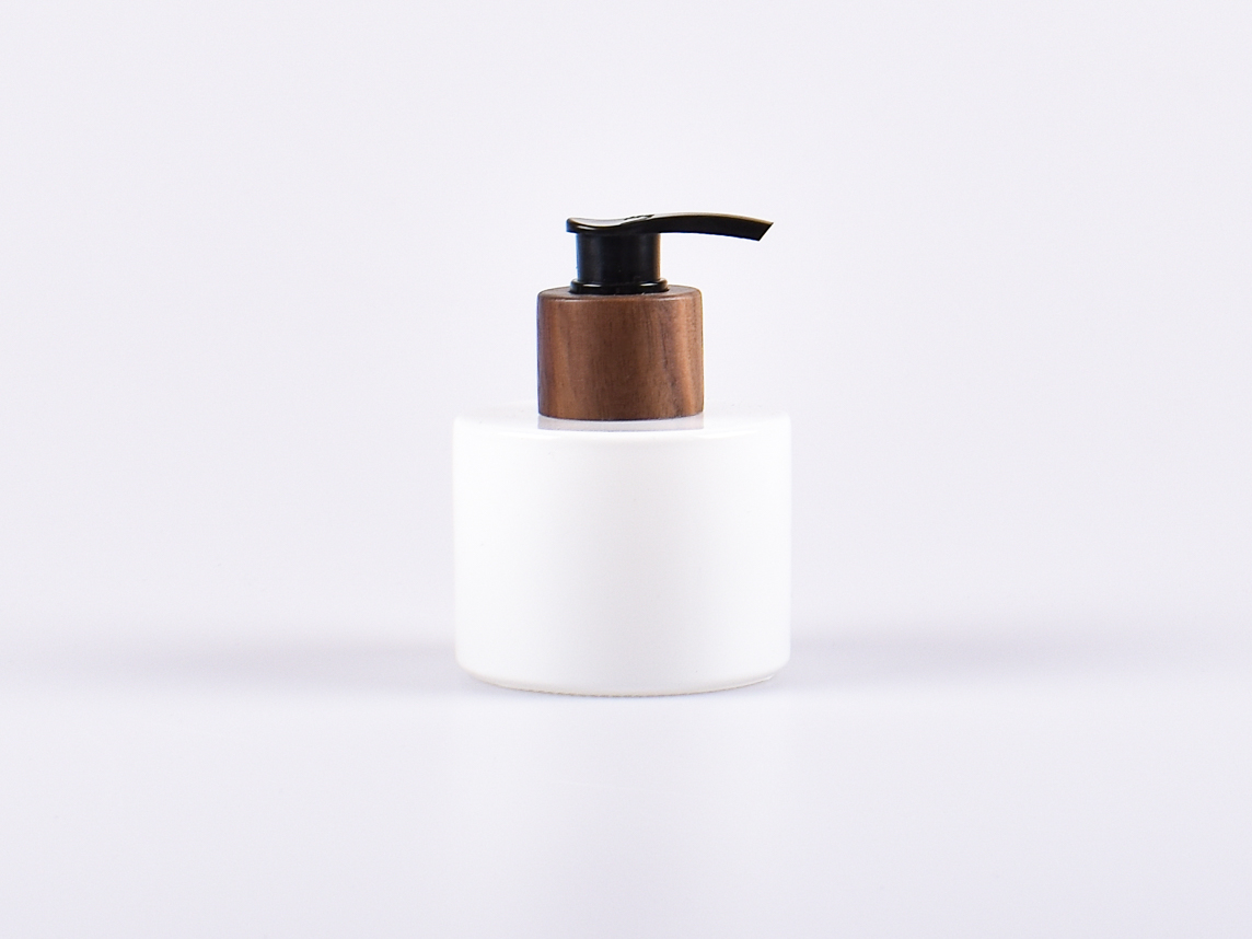 Stilvolle runde, niedrige Weissglasflasche mit Dispenser, eingefasst mit echtem Nussbaumholz. Unsere hochwertige Flasche bietet nicht nur eine robuste Verpackung für Ihre flüssigen Produkte, sondern schützt auch empfindliche Inhaltsstoffe vor schädlichen UV-Strahlen.