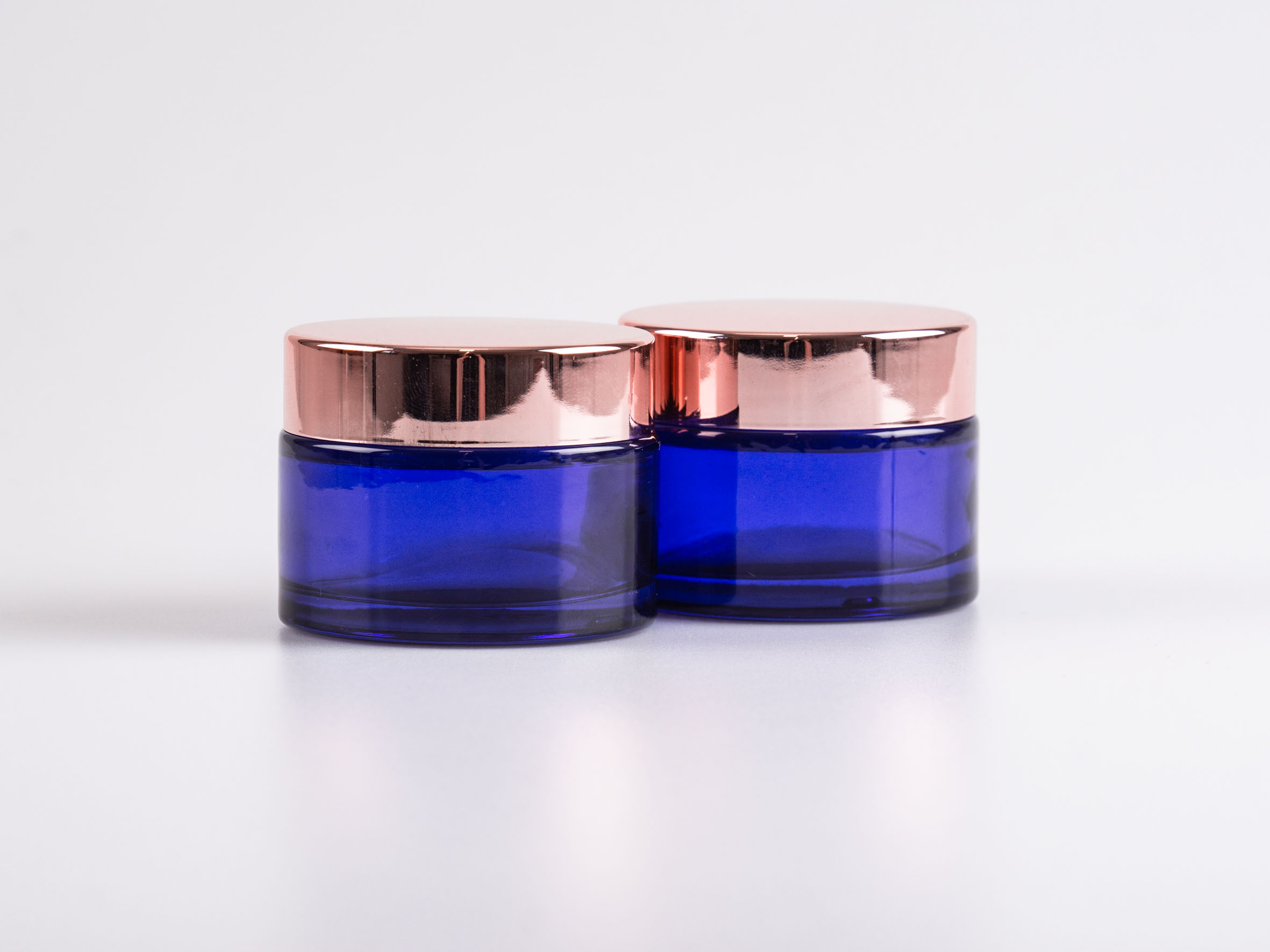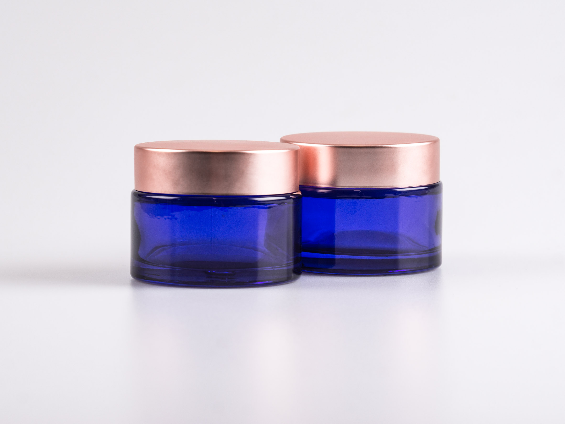 Sehr edle Kosmetikdose aus blauem Glas. Diese Glasdose eignet sich besonders für Naturkosmetik, da das blaue Glas vor UV-Licht schützt.