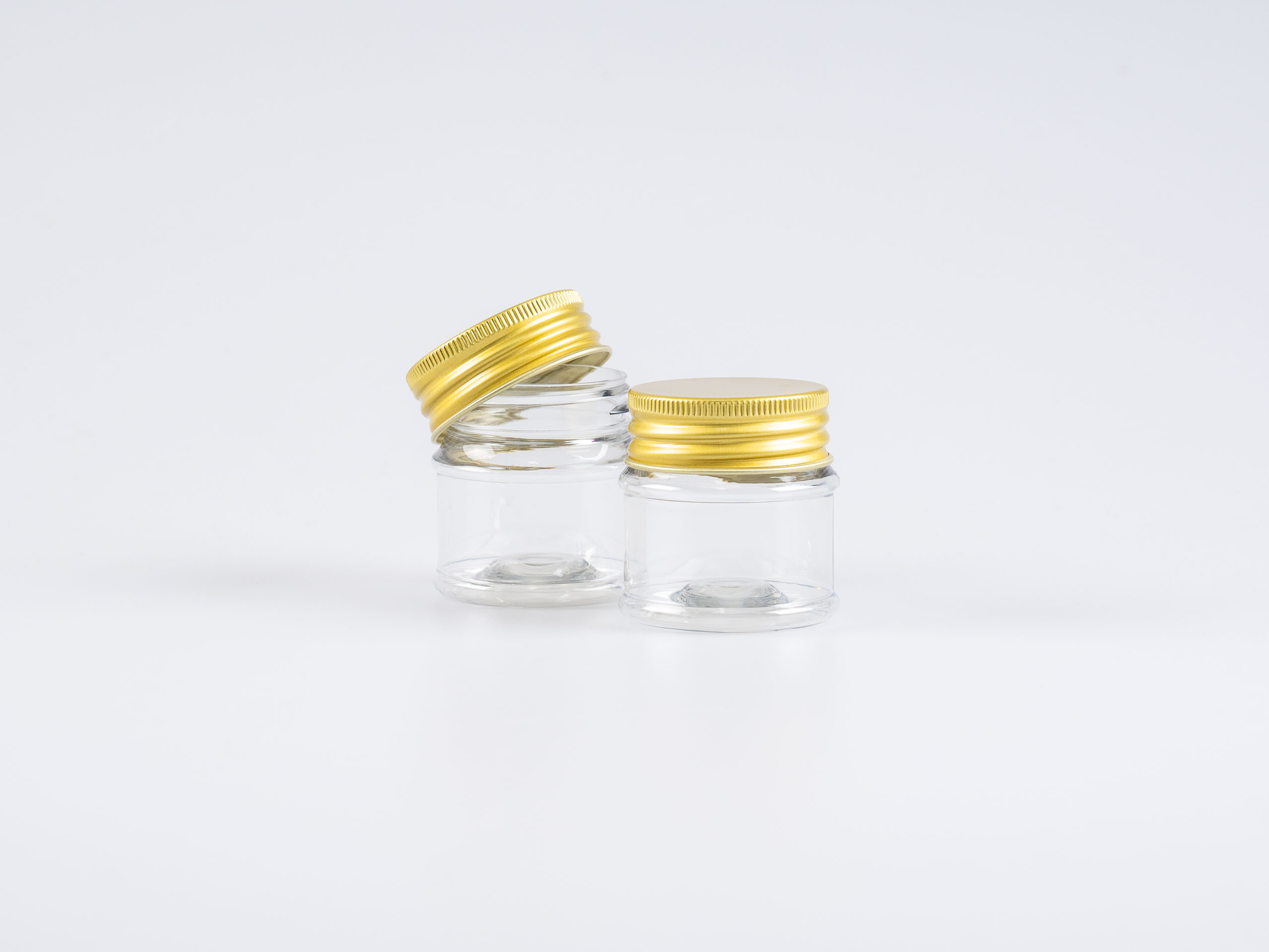 Glasklare Kunststoffdose mit Aludeckel in 3 Farben.