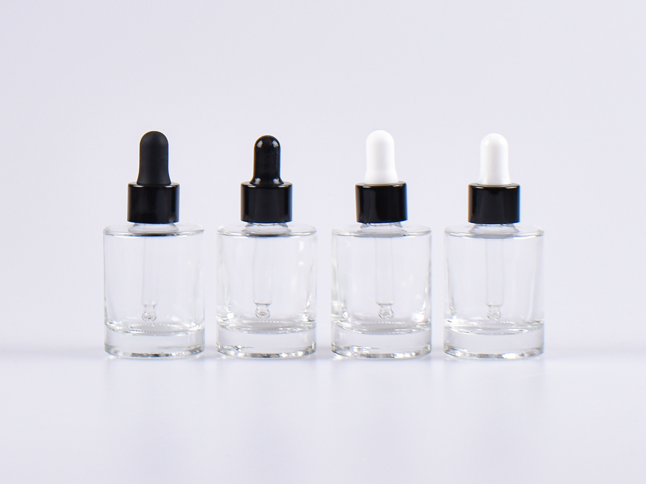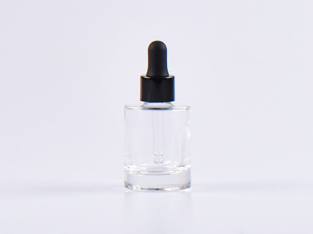 Hochwertige Glasflasche mit schwarz-glänzender Pipettenmontur.