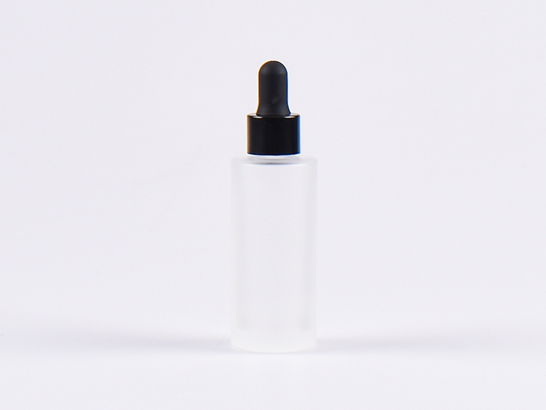 Hochwertige, edle Glasflasche mit Pipettenaufsatz aus Aluminium.