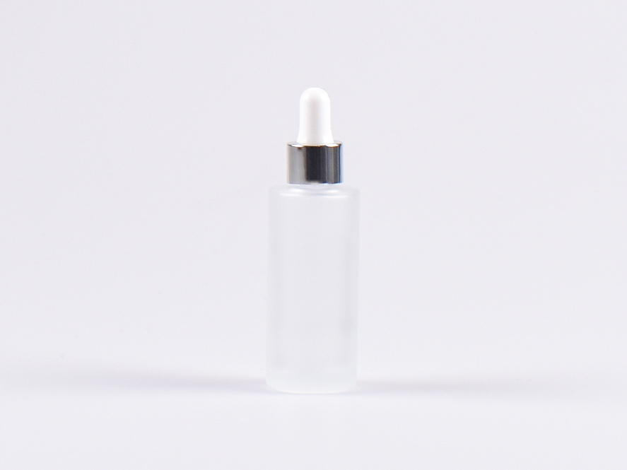 Hochwertige, edle Glasflasche mit Pipettenaufsatz aus Aluminium.